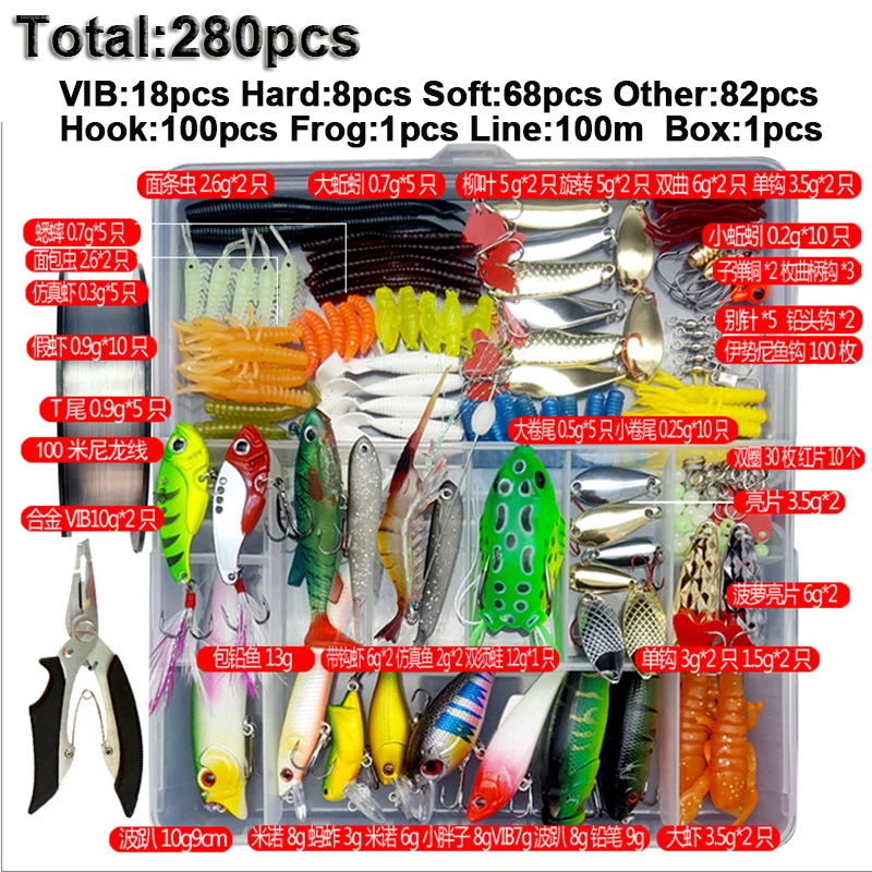 Addition Information of 33/56/104/106/109/122/142/166/280pcs Fishing Lures Set Spoon Hooks Minnow Pilers Hard Lure Kit In B